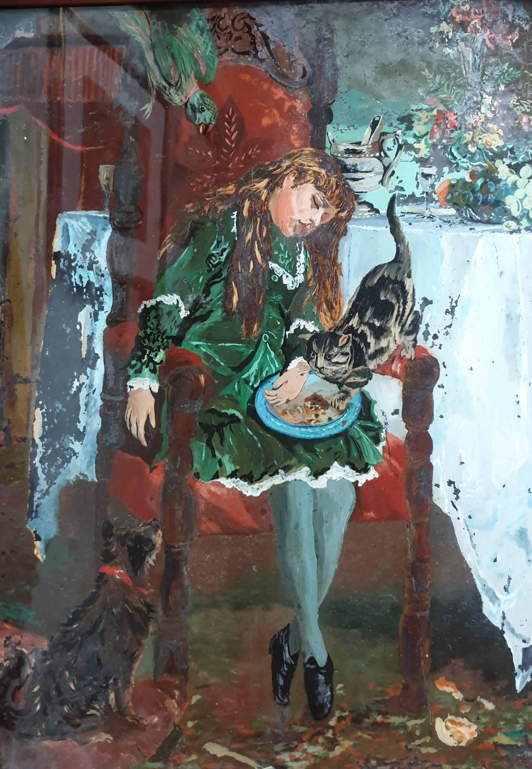 Australian reverse glass painting of a cat stealing the dinner c 1890