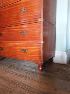 A good quality & scarce English made mahogany campaign chest in two sections, brass bound & flush mounted for travel. With the original detachable turned feet, Hobbs & Co of London patent brass locks & in excellent condition.The drawers with a line mould to the edges, with internal quadrant moulds & ash lined. 113cm H x 106cm W x 50cm deep.
