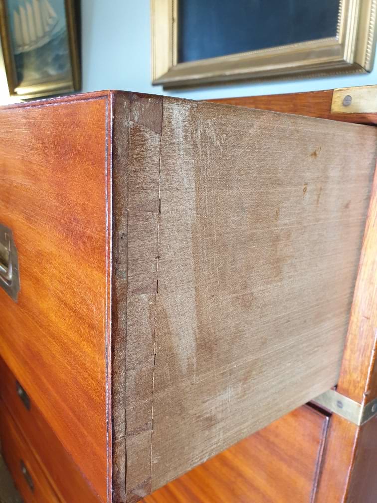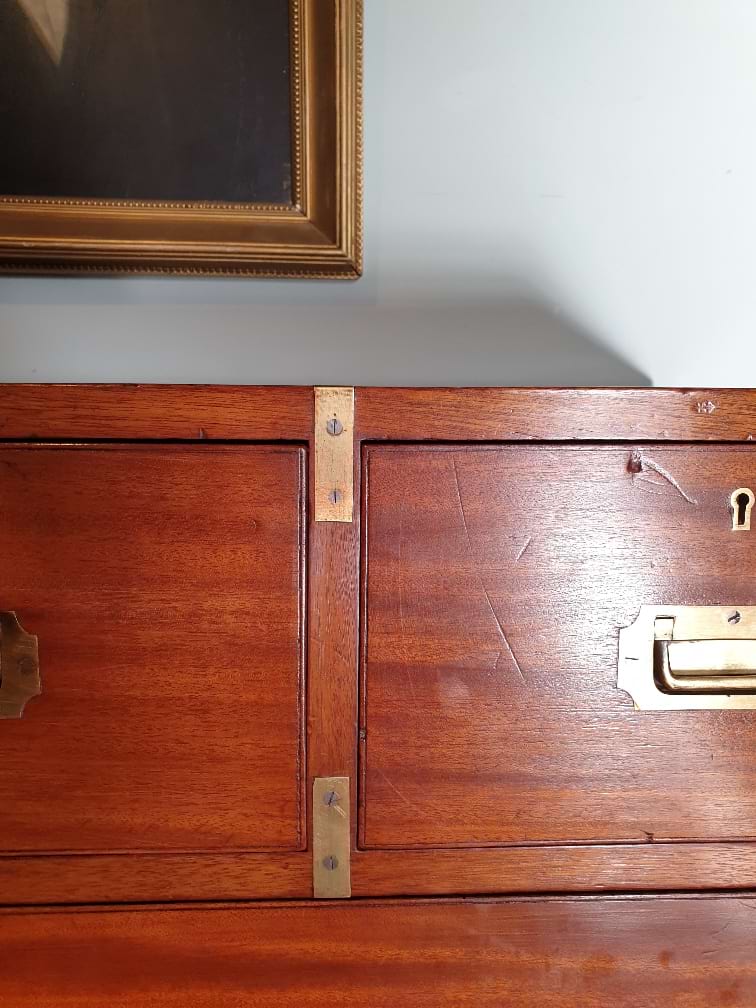 A good quality & scarce English made mahogany campaign chest in two sections, brass bound & flush mounted for travel. With the original detachable turned feet, Hobbs & Co of London patent brass locks & in excellent condition.The drawers with a line mould to the edges, with internal quadrant moulds & ash lined. 113cm H x 106cm W x 50cm deep.
