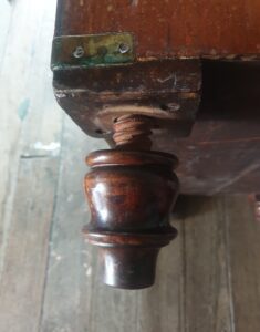 A fine & scarce English made mahogany campaign chest of drawers, made in two parts with brass bindings & iron carrying handles, for travel. Terrific colour, iron locating pins & original threaded feet, removeable for travel. The whole of nice compact size. With the original card delivery / retailer’s label for Isaac Allen, upholsterer of 15 Gt Norwood St Cheltenham. The Allen family of London were the longest running campaign kit makers, in business from c1790 to WW1. This is typical of their work, & interesting for the retailer’s link. 95cm H x 91cm W x 46cm D.