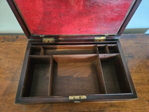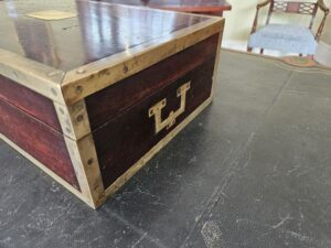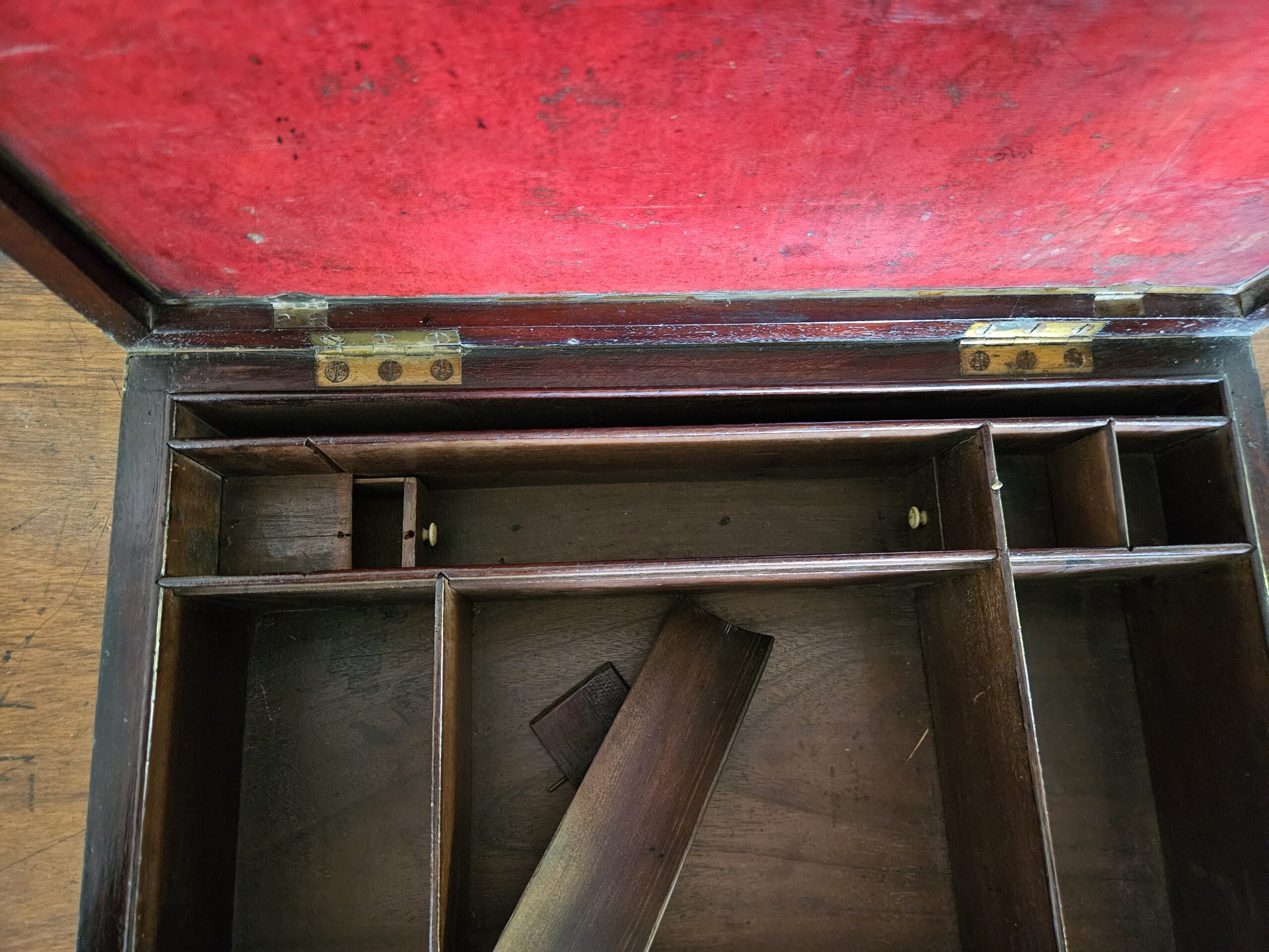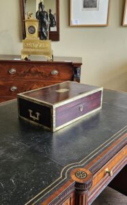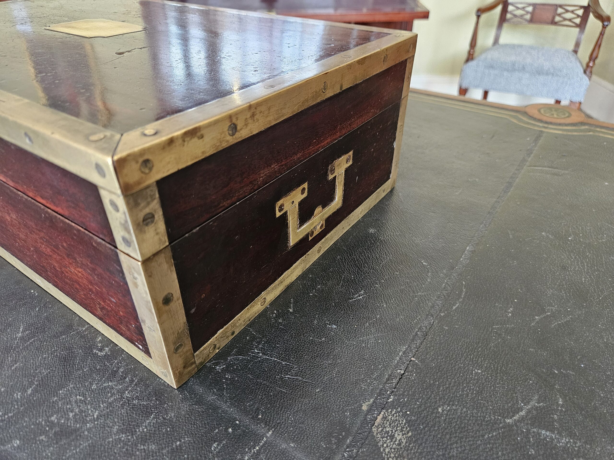 A good quality English Regency period campaign document box, in heavy mahogany, brass bound for travel. The interior containing the original morocco leather. With skeletal flush handles for transport, to the ends. Original interior containing two secret drawers. UK origin c1810. 14cm.H x 42cm x 31cm D