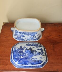 A rare and large Chinese (Canton) exportware soup tureen of canted rectangular form. The lid with stylized melon branch handle, the handles to the ends as boar’s  heads. With underglaze painted enamels of scenes on the Pearl River. The tureens are the largest and rarest of the Chinese exportware dinner service items,  sent & sold  to Westerners as proof of their exotic tastes. C. 1800 -1820. Excellent unrestored condition  – two tips to boar’s ears lost.  Ht 22cm.Wd 32cm Dp22cm.