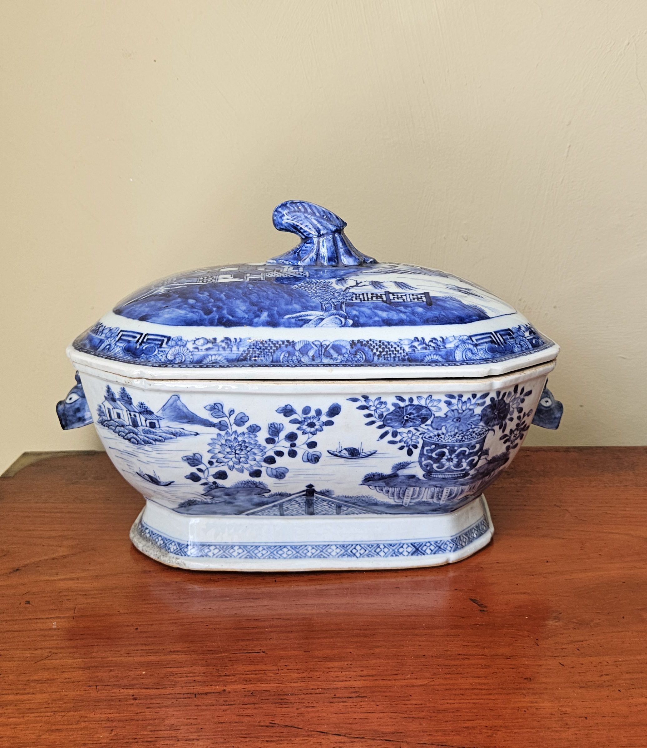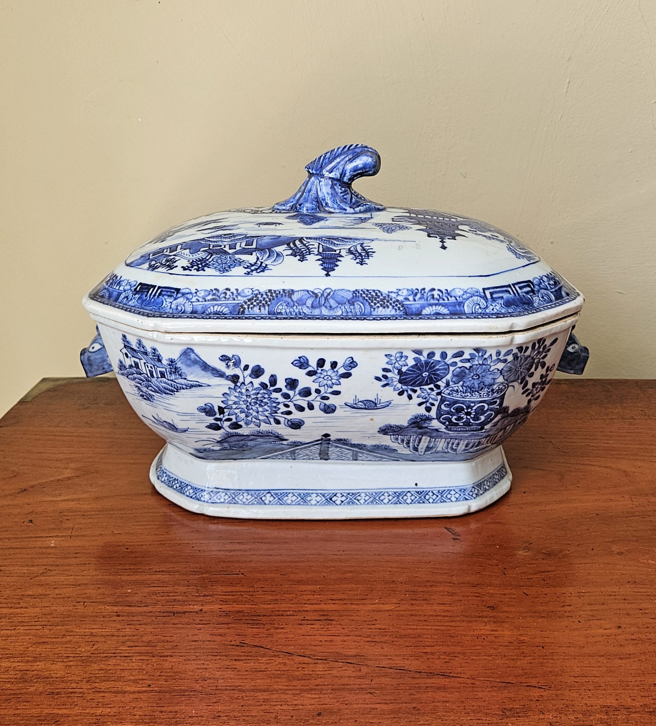 A rare and large Chinese (Canton) exportware soup tureen of canted rectangular form. The lid with stylized melon branch handle, the handles to the ends as boar’s  heads. With underglaze painted enamels of scenes on the Pearl River. The tureens are the largest and rarest of the Chinese exportware dinner service items,  sent & sold  to Westerners as proof of their exotic tastes. C. 1800 -1820. Excellent unrestored condition  – two tips to boar’s ears lost.  Ht 22cm.Wd 32cm Dp22cm.