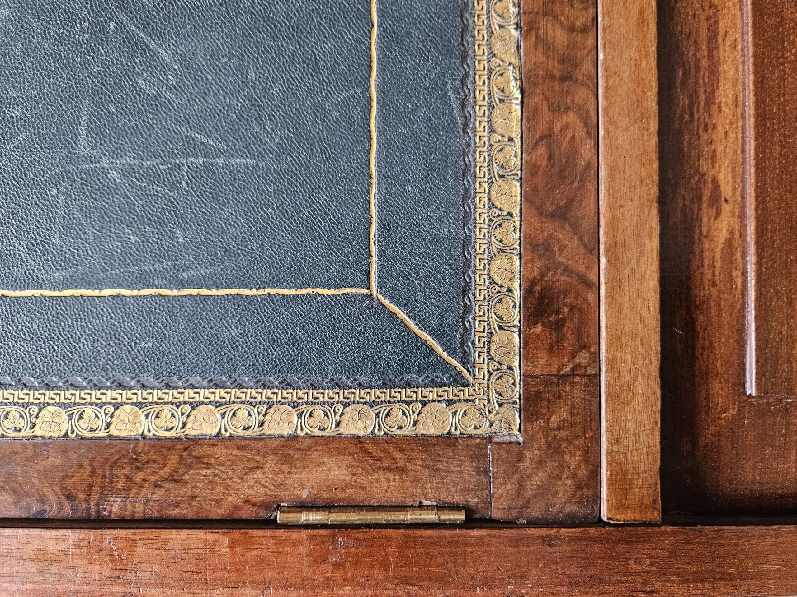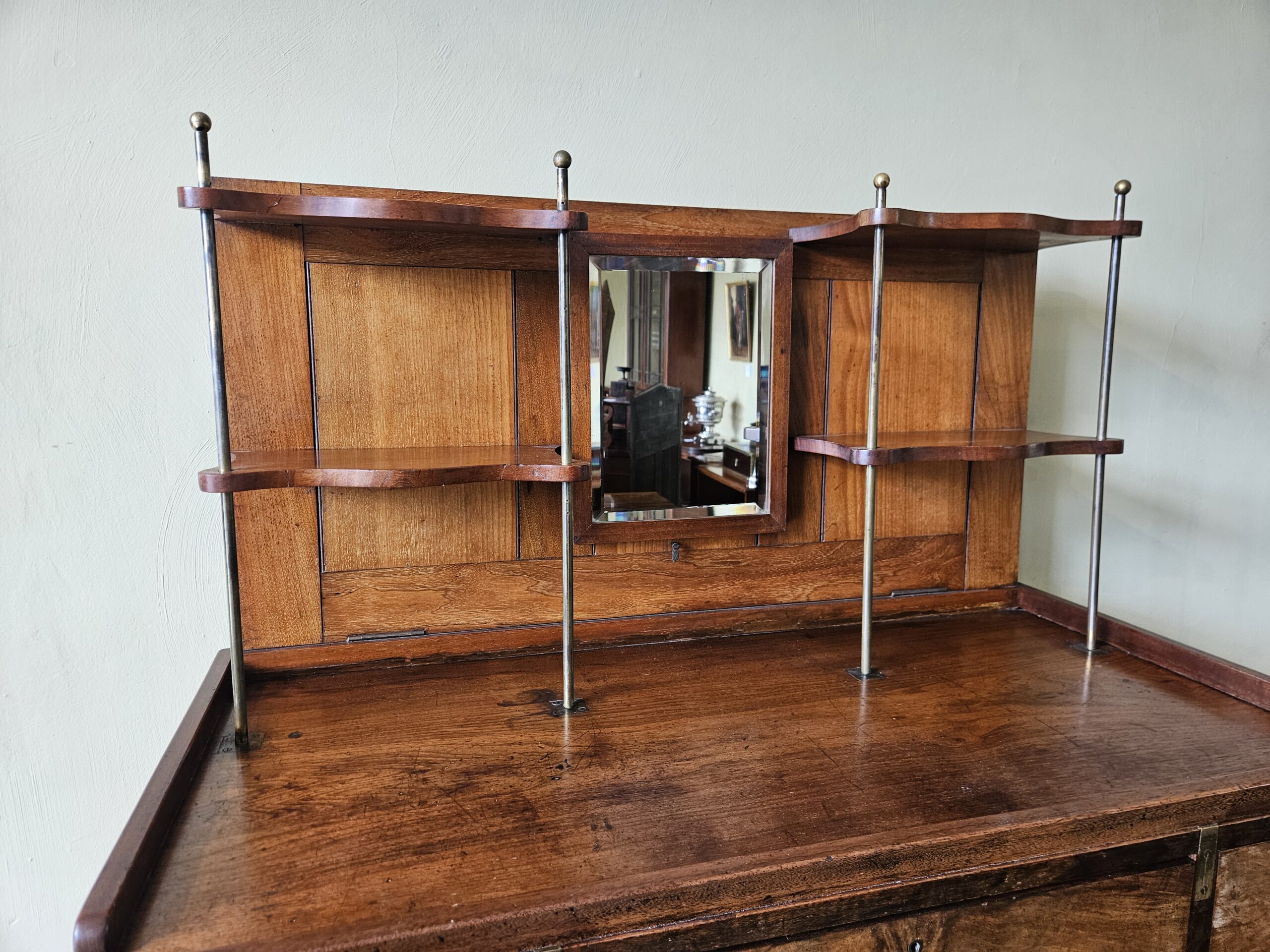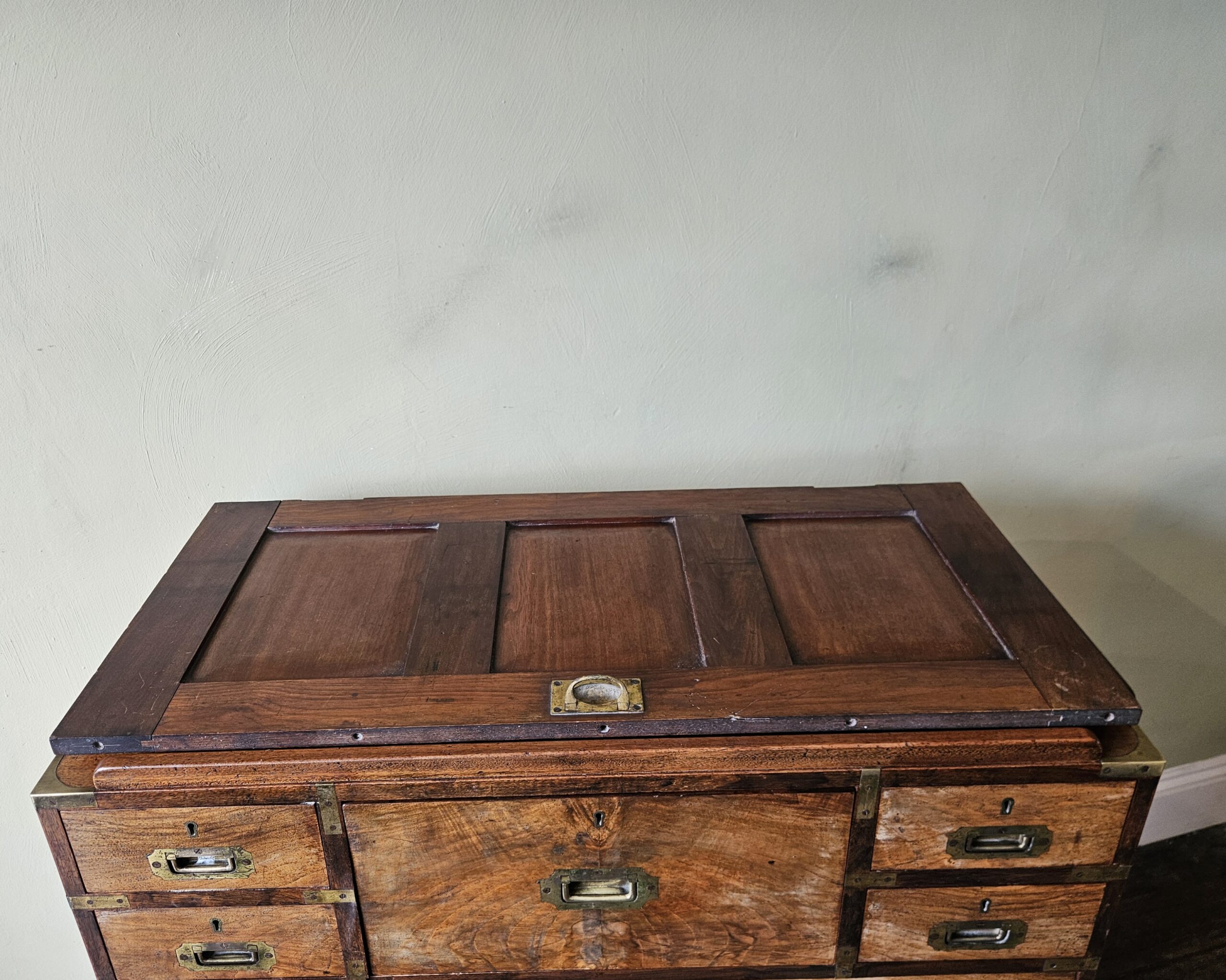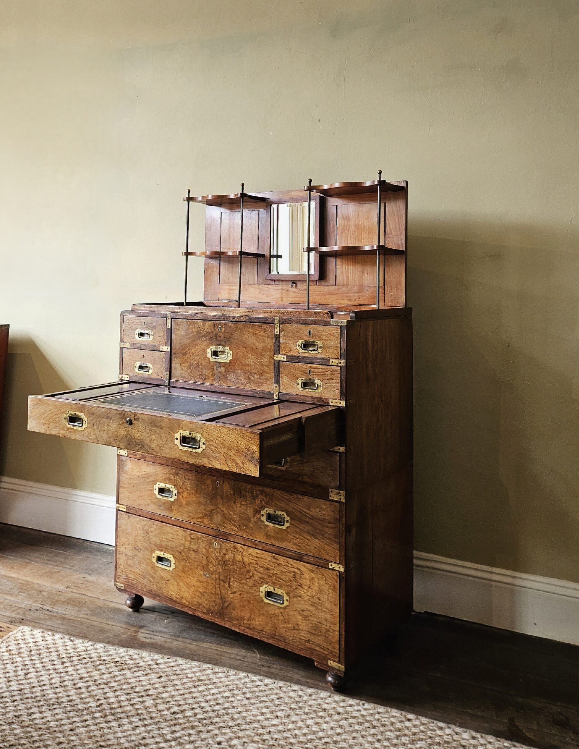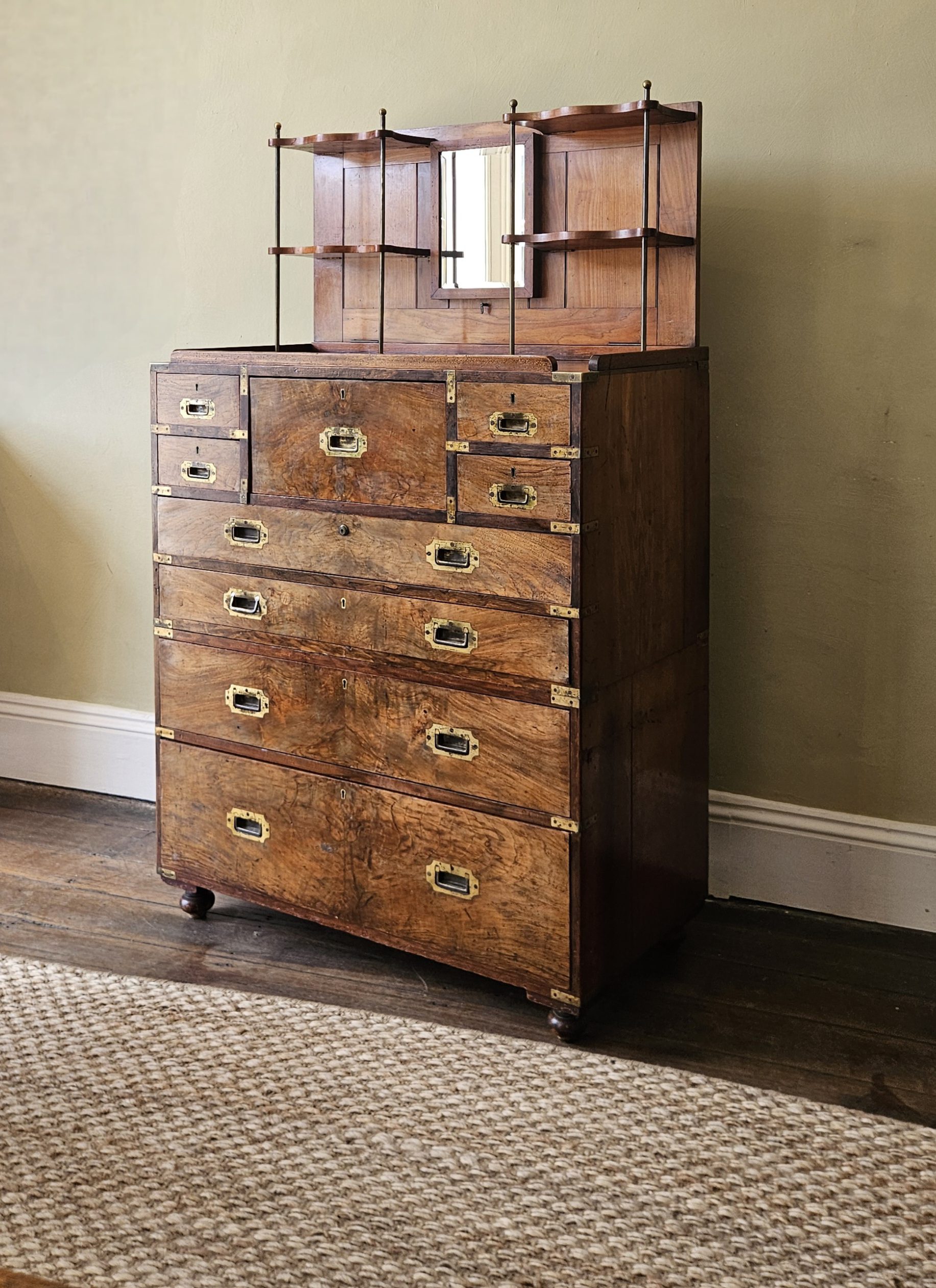 The top unfolds to produce hinged bookshelves, an adjustable dressing mirror, with fitted writing & stationery boxes that also unfold. In two sections for ease of transport for military campaign travel. Untouched excellent original condition with good colour & patina. Mahogany veneered with walnut to the drawer fronts, original lacquer to brass, leather, mirror, Bramah & Lever locks, & removable feet. After 150 years the drawers still move like silk. 163cm H x 100cm W x 51cm D.