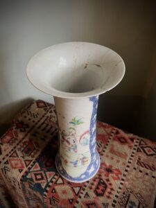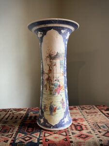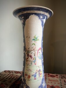 Canton, of archaic bronze form, decorated in famille rose enamels, with underglaze cobalt blue enamels of butterflies. Damaged. 37cm H x 19.5cm W. Price inc GST $350