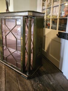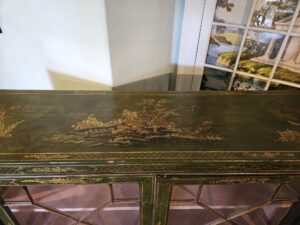 A rare and very decorative English Regency revival green lacquered, red lacquer, silvered & gilt Chinoiserie lowbookcase,in excellent condition. The doors with astragal glazing, reeded columns and glazed lattice panels to the corners. Original reeded shelves and deep enough for modern art books. UK origin c1880. 112cm H x 144cm W x 44cm.D.