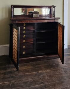 An excellent quality & very handy English William IV period rosewood chiffoniere / collector’scabinet, c1830. Original brass gallery & elliptical grilles, backed by faded orange pleated silk. The interior fitted to one side with a collector’s cabinet. All in original condition..
