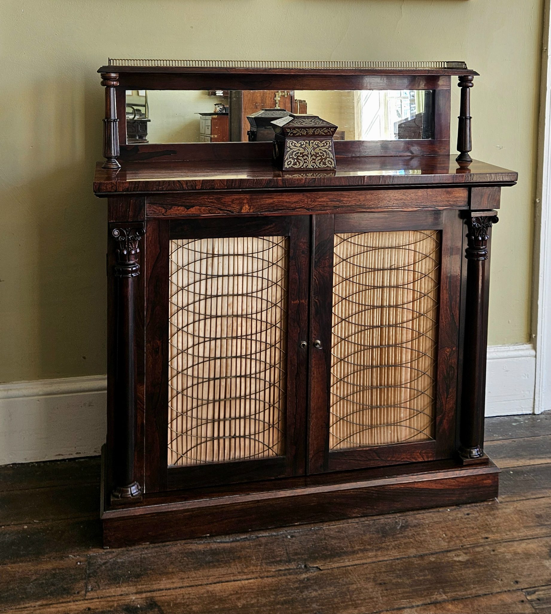 An excellent quality & very handy English William IV period rosewood chiffoniere / collector’scabinet, c1830. Original brass gallery & elliptical grilles, backed by faded orange pleated silk. The interior fitted to one side with a collector’s cabinet. All in original condition..