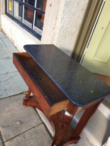 A chic French Empire mahogany console table, of perfect size for a hall. With a drawer, original fossil laden marble top. The legs finely formed with carved paw feet. Good patina & colour. 91x 91 x 41cm.
