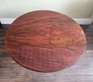 A magnificent Irish George IV period mahogany dining table with solid top, reeded edge, on the most wonderful carved & triple ring turned column, leaf carved legs & massive paw feet.