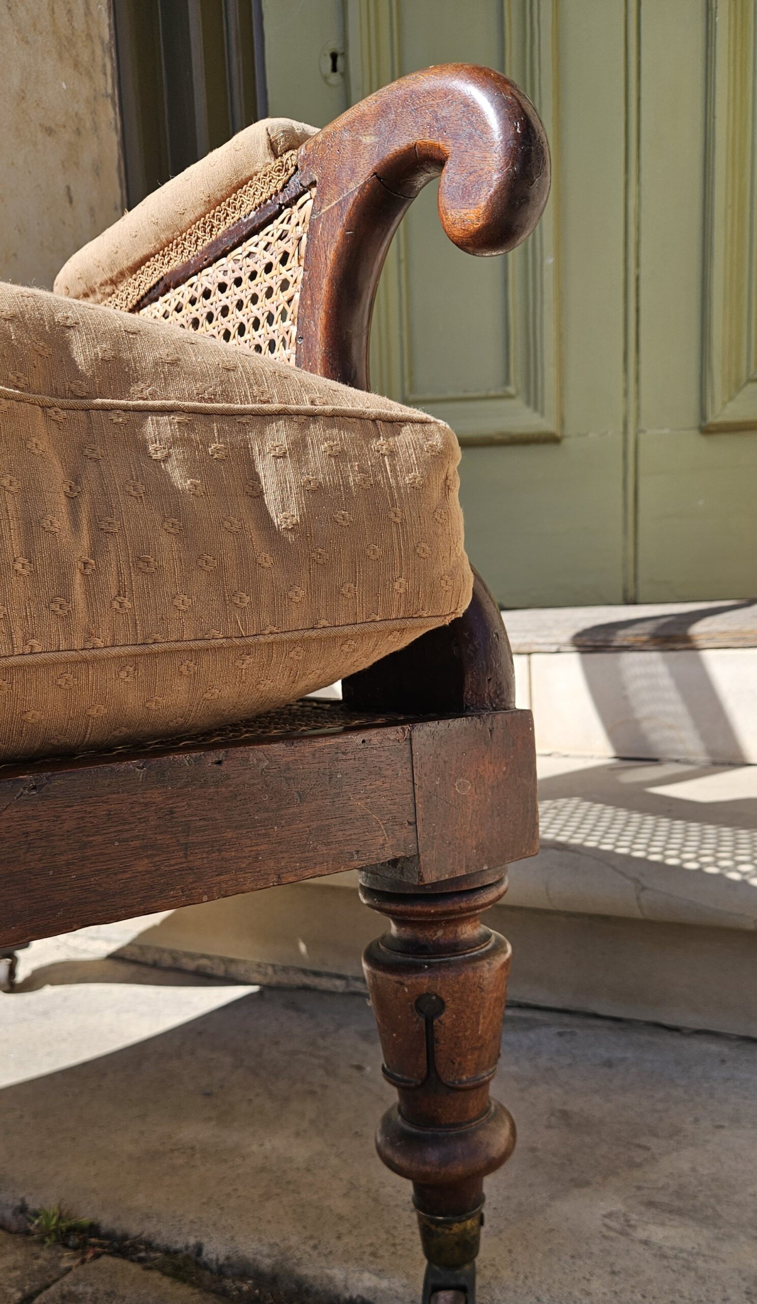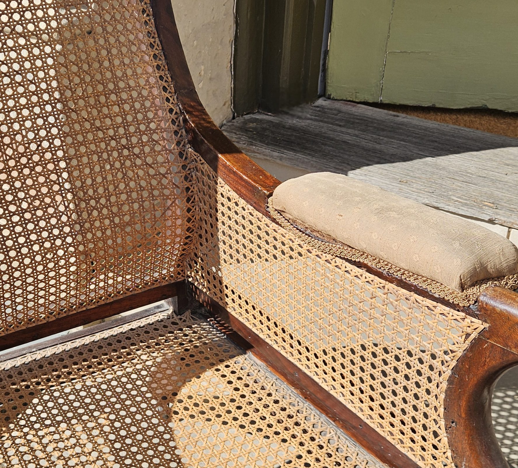 An elegantly formed & very comfortable English George IV/ William IV period mahogany library bergere chair. With recently re hand caned seat, back and sides, overscrolled arms, centurion skirt carved front legs & rectangular back. The back arched backwards, forwards & with sabre legs to achieve a wonderfully elegant profile in a room. Duck down cushion seat & good original patina. U.K c 1830. 110cm H x 65cm W.