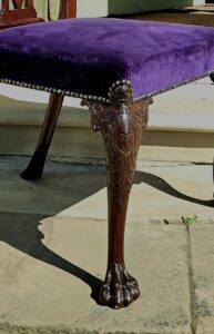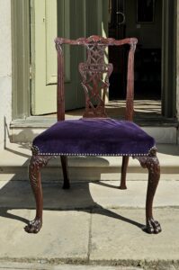 A beautifully carved Irish ‘Chippendale’ mahogany chair, with entwined lattice carved back and hairy paw feet, the knees with carved acanthus & ‘C’ scrolls. The back legs finely drawn ending in a square block foot.