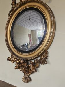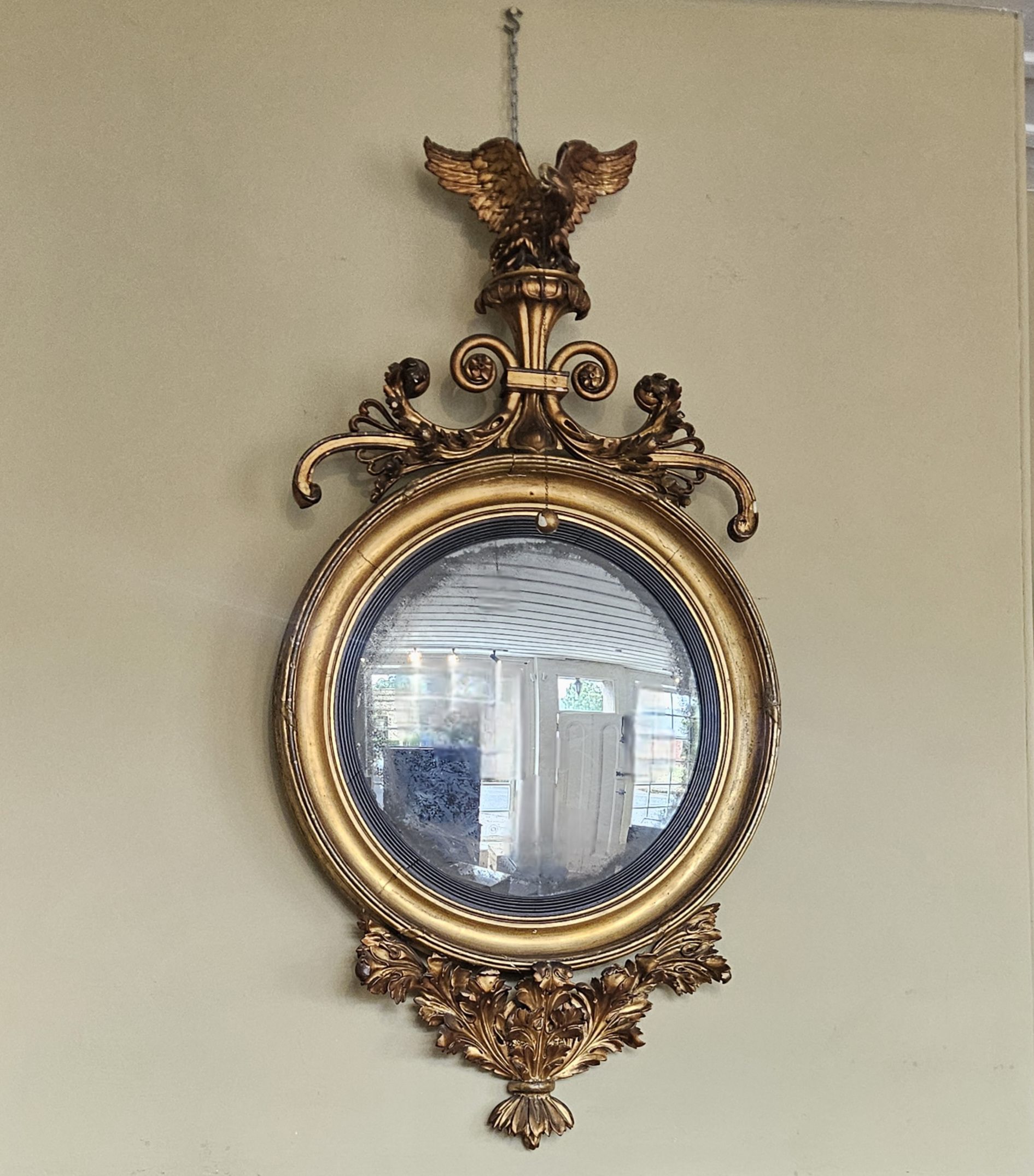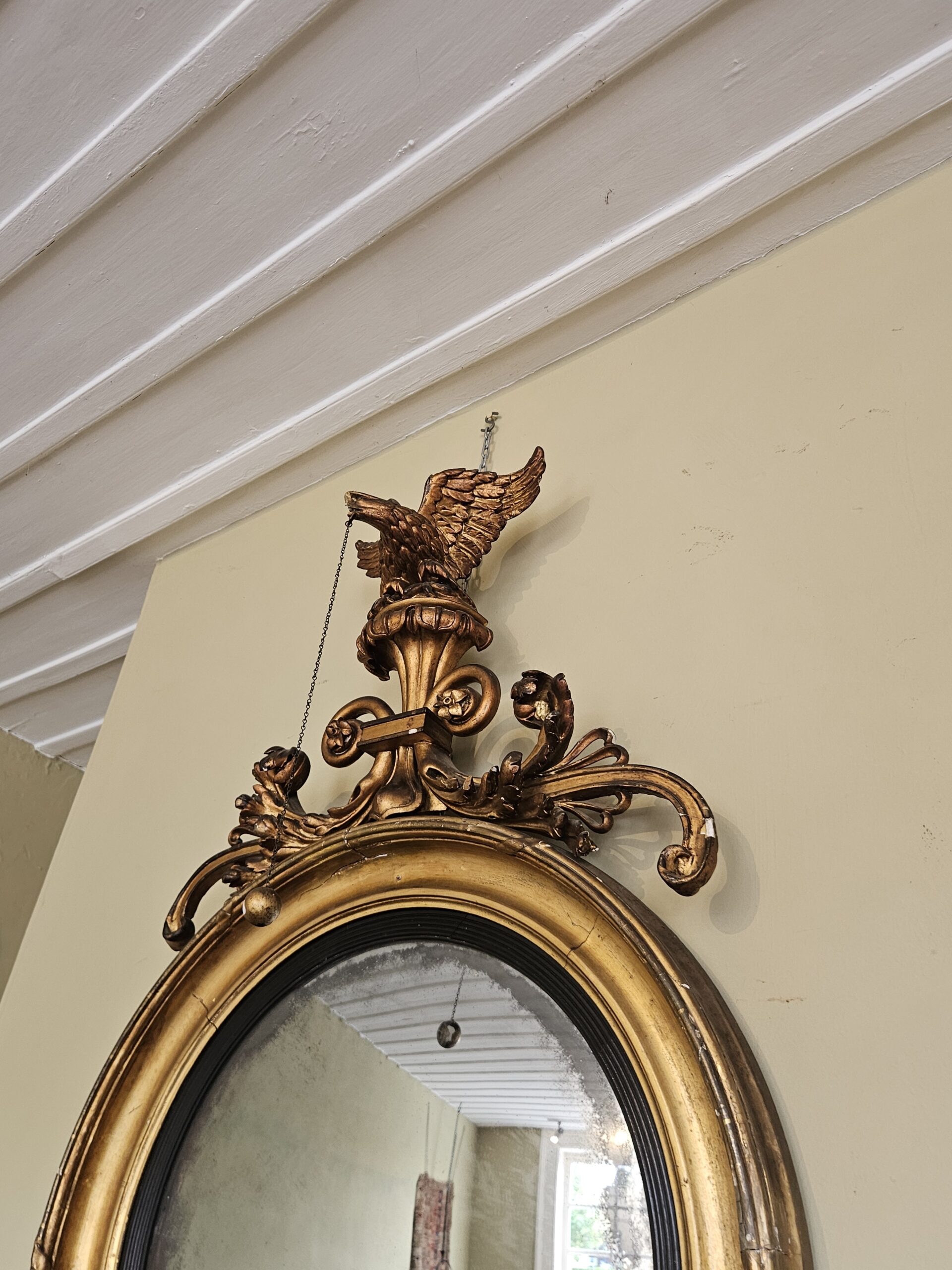 With original gilding & mercury silvered plate, no evidence of ever being fitted with candle arms. The carved elements original to the frame, with richly carved acanthus, topped by an Eagle in flight, pairs of anthemions and a deep moulded frame with inset reeded ebony slip & the mirror in excellent antique condition. UK origin c1815 -20. Ht 148cm x 78cm W x 25cm D. PRICE inc GST $8,800