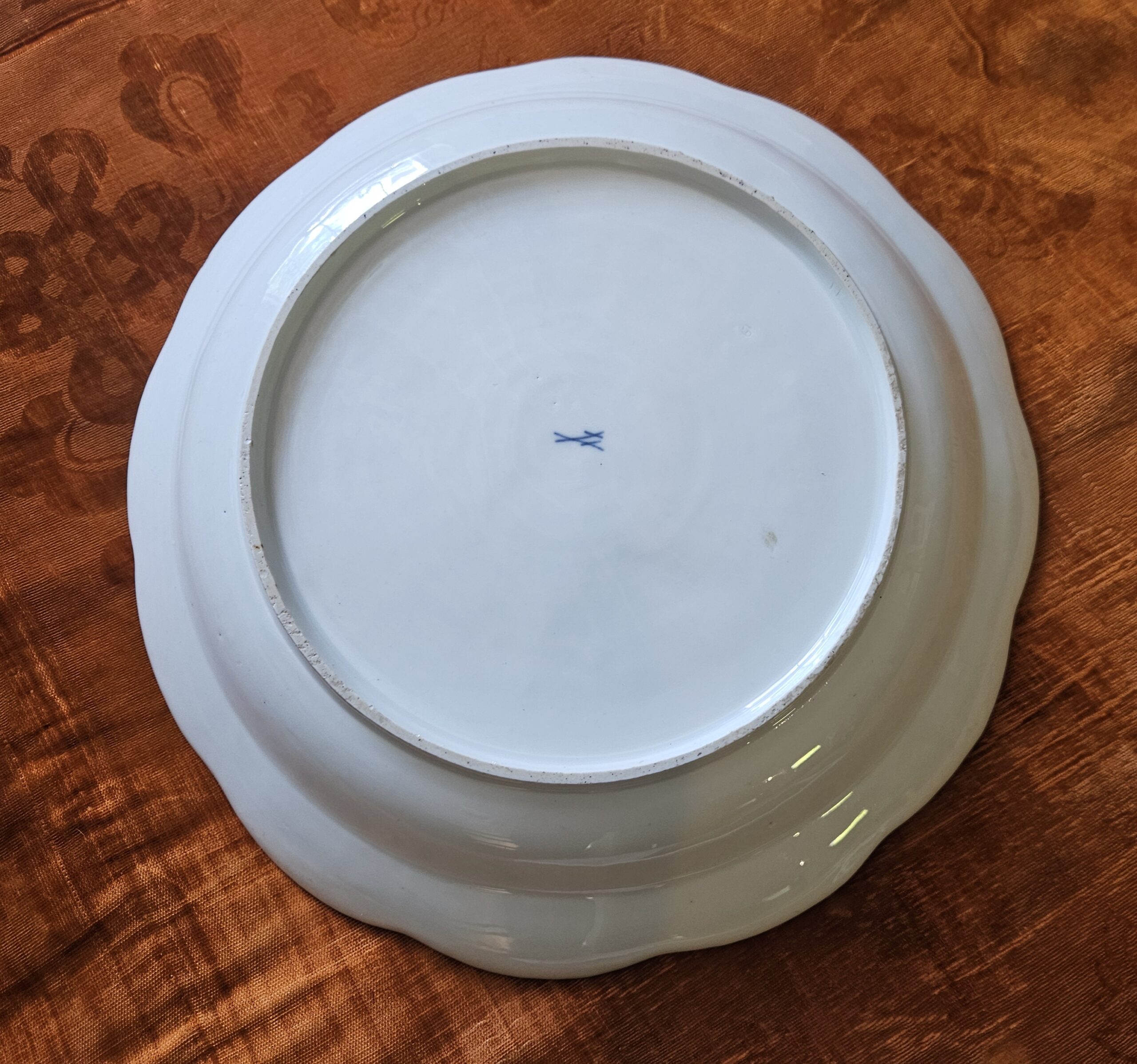A large, 18th century Meissen porcelain deep serving plate, with woven basket Ozier pattern rim. Beautifully painted with naturalistic sprays of wildflowers in the Rococo taste for Rustic & a return to the natural world. 18th century Meissen porcelain is a rare & wondrous subject.