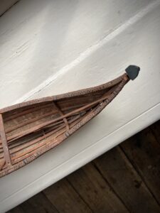 The making of timber accurate scaled canoes by first Inuit people was both a teaching aid, anthropological object and item for sale.They are rare to survive, this example with an old collection note helps with the dating. 64cm L x 13cm W x 7cm H. Price Inc GST $850.