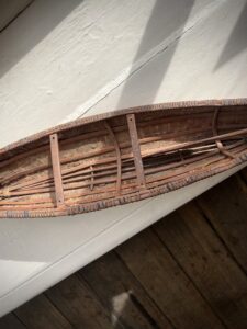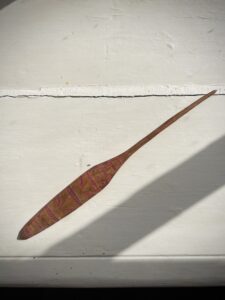 The making of timber accurate scaled canoes by first Inuit people was both a teaching aid, anthropological object and item for sale.They are rare to survive, this example with an old collection note helps with the dating. 64cm L x 13cm W x 7cm H. Price Inc GST $850.