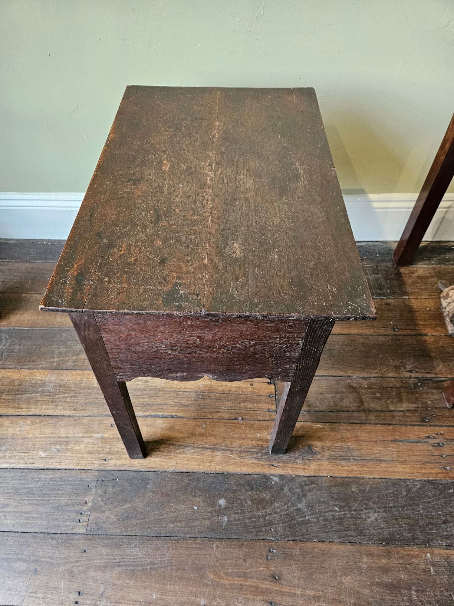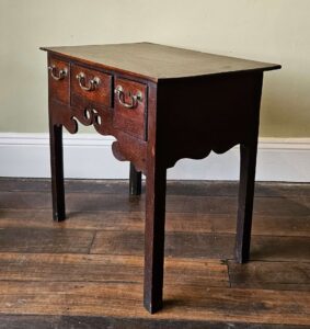 A lovely English oak lowboy, with original brass swans neck handles, and waxed finish. Essentially in perfect original condition, featuring a lovely scalloped frieze to the front & sides, square chamfered legs & fine oak two plank top, three drawers. Excellent colour & patina. The size suits well as a lamp, sofa or bedside table. 71cmH x 77cm W x 50cm D. UK origin c1760