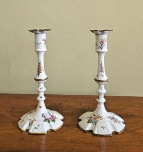 A rare pair of George III period enamelled copper candlesticks, of silver shape, with the original sconces & in excellent condition for the fragility of the medium. With finely enamelled sprigs of flowers, the edges in gilt copper.