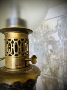 French, with Cantonese famille verte export-ware porcelain fonts, bronzeA very pair of whale or colza oil lamps, with integral clockwork pumps and original wick raisers and burners. The pumps pushed a piston to raise the low ignition fuel, to a circular wick, without shadow. The circular chimney multiplied the flame by four, the outer flask shaped shade by another four. The making of lamps with Canton porcelain is rare. 65 H x 13cm W. Price inc GST $2,800