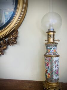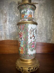 French, with Cantonese famille verte export-ware porcelain fonts, bronzeA very pair of whale or colza oil lamps, with integral clockwork pumps and original wick raisers and burners. The pumps pushed a piston to raise the low ignition fuel, to a circular wick, without shadow. The circular chimney multiplied the flame by four, the outer flask shaped shade by another four. The making of lamps with Canton porcelain is rare. 65 H x 13cm W. Price inc GST $2,800