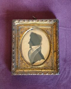A finely drawn, painted & cut portrait silhouette of a young man in a frock coat, contained in the original gilt copper frame & glass. UK c 1810