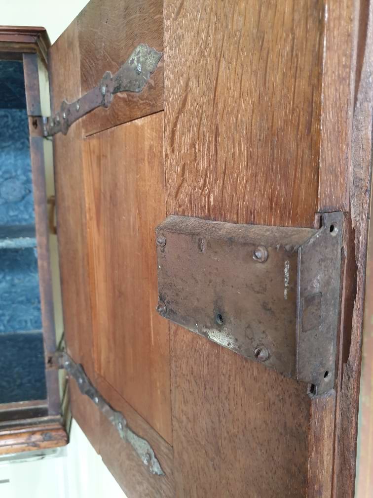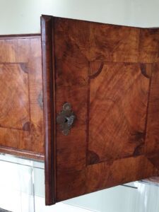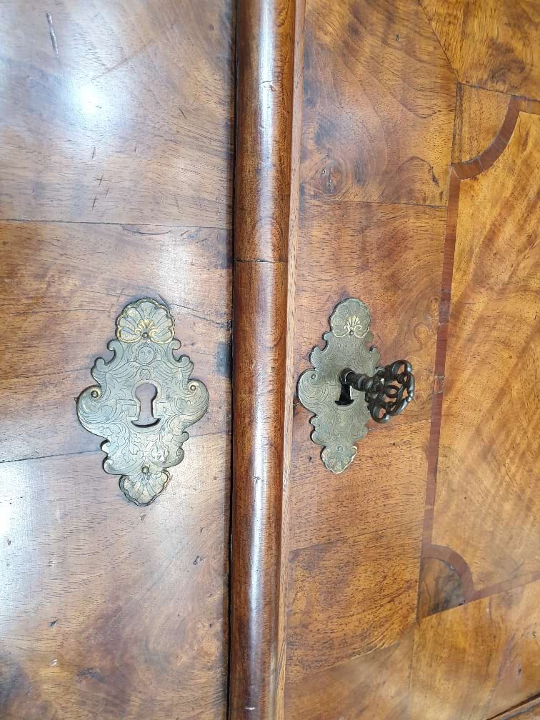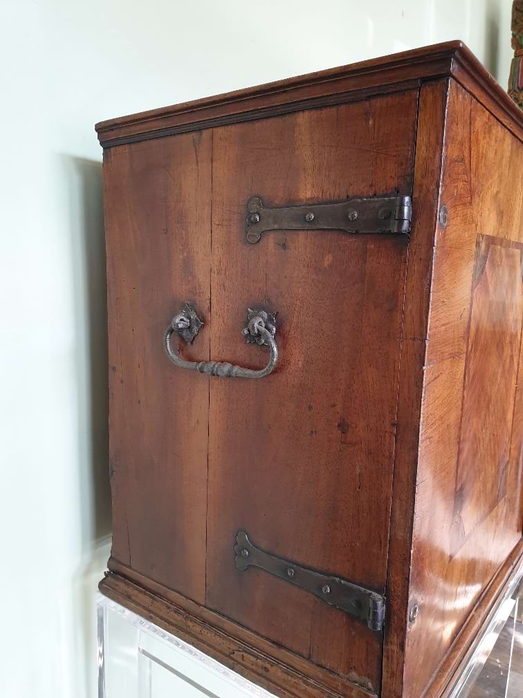 A South German marquetry cabinet c 1740. In finely figured walnut, onto oak & poplar with a good old patina. The doors with contrasting panels and quadrants of dark walnut, the top with geometric marquetry. Mounted with blued steel carrying handles, and fine original lock, hinges & key. The brass escutcheons with engraved faces & remains of gilding. The interior with original decoration painted in cobalt of clouds.