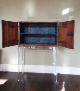 On new lucite stand.For a collection of wonders, or a snazzy drinks cabinet?